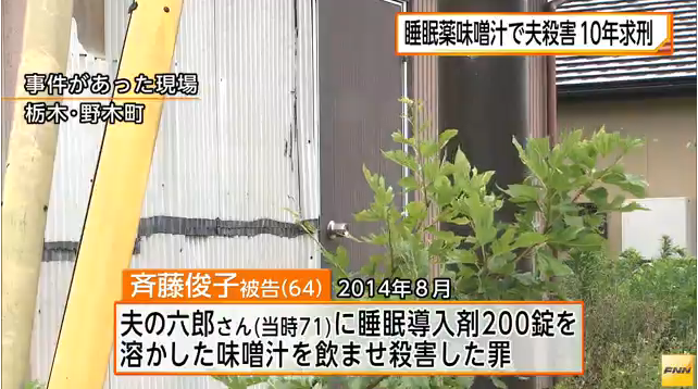 【社会】睡眠薬200錠入りみそ汁で夫を殺害、懲役10年求刑 - 栃木