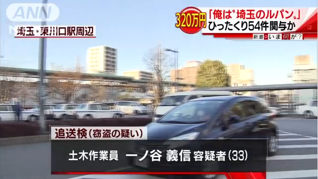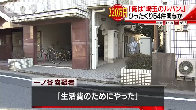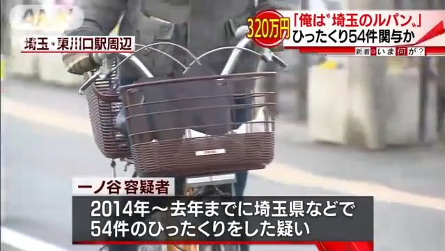 土木作業員の一ノ谷義信容疑者(33)は、2014年から去年までに埼玉県などで54件のひったくりをした疑いでさいたま地検に追送検されました。被害は、現金やバッグなど合わせて320万円相当に上ります。警察によりますと、去年11月、ナンバープレートのない原付きバイクに乗ろうとした一ノ谷容疑者に警戒していた捜査員が職務質問したところ、ひったくり事件で奪われた財布などを持っていたため逮捕に至りました。取り調べに対し、「生活費のためにやった」と容疑を認めていて、「俺は『埼玉のルパン』だ」などと話しているということです。