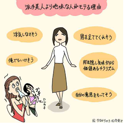 地味女子を好きなのは、普通の男子でしょ。世の中には普通の男子が圧倒的に多いからモテる。っていう構図だよね。数少ないイケメンは数少ない美人にいくよ。