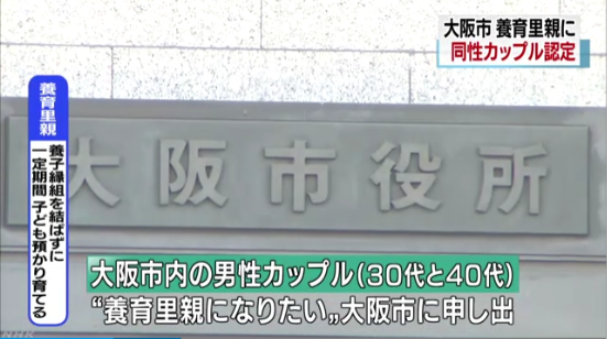 大阪市によりますと、去年9月、市内に住む30代と40代の男性のカップルから、里親制度のうち、養子縁組を結ばずに一定期間、子どもを預かり育てる「養育里親」になりたいという申し出を受けました。