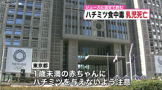 東京都によると、足立区でジュースにハチミツを混ぜ離乳食として食べた生後5か月の男の赤ちゃんが、ハチミツが原因とみられる食中毒で死亡した。