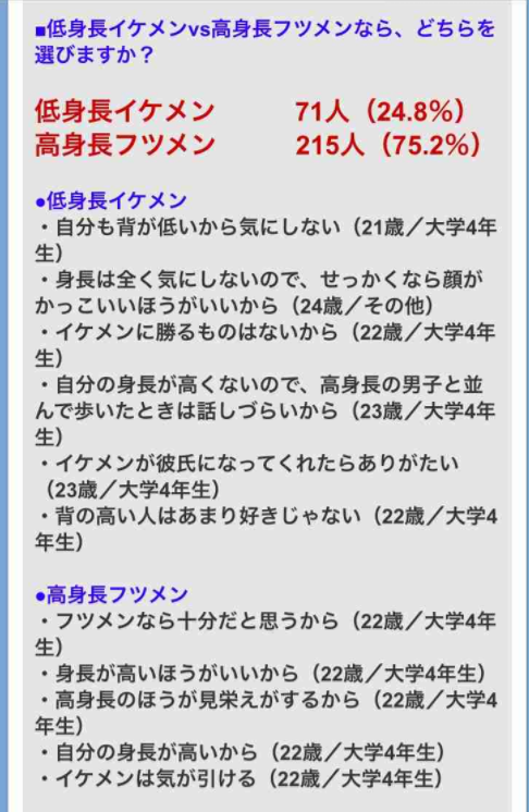 ここの体験談見ても、身長は気にしないけど彼氏が気にしたりナメられないように虚勢を張ってるのが嫌だって人が大半だもんね