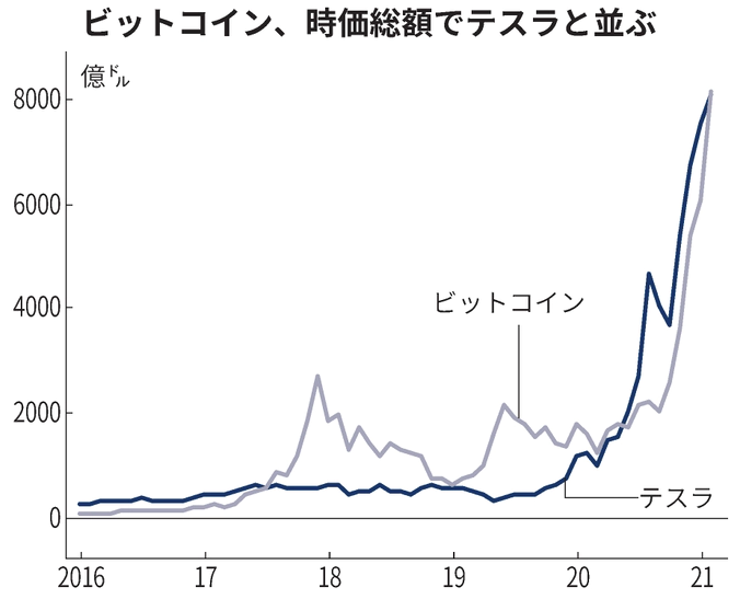 ・ビットコインの相場が8日、最高値を更新した。電気自動車メーカーの米テスラが15億ドル(約1580億円)をビットコインに投じたほか、ビットコインでの支払いを受け入れる方針を明らかにしたのが手掛かりとなった。