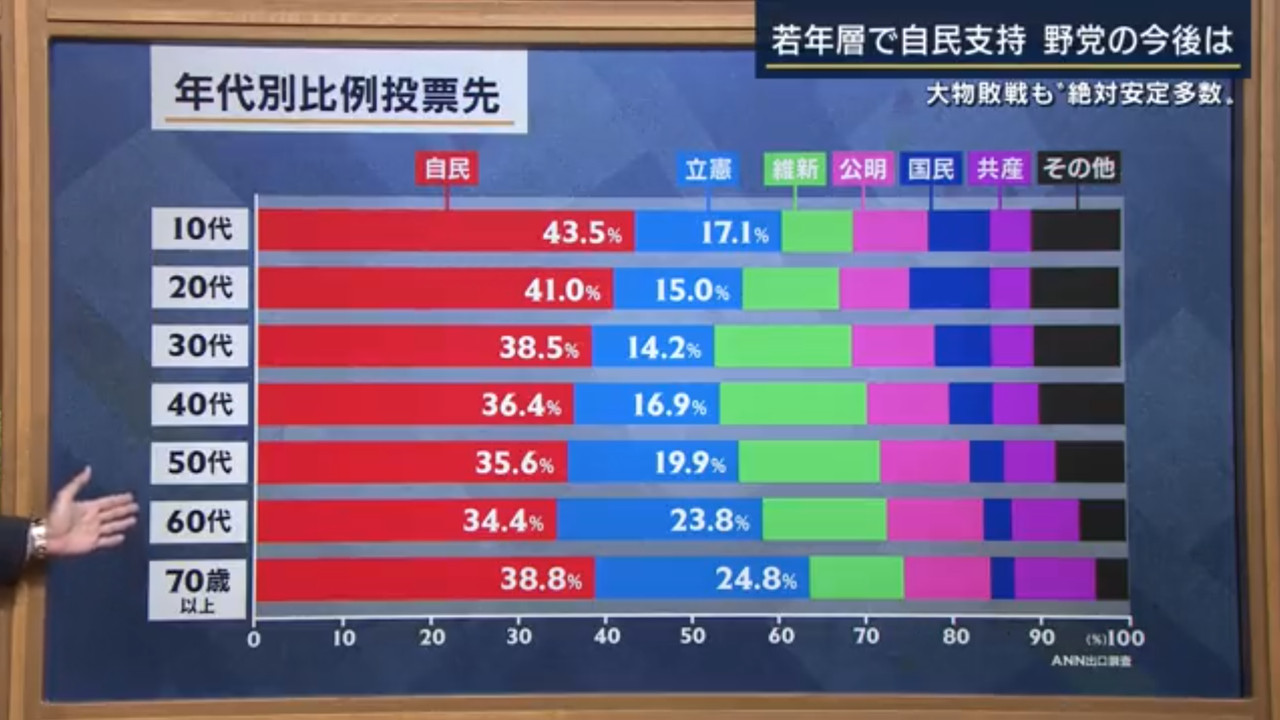 比例投票先を年代別に見ると #10代 で43.5%、#20代 で41.0%が自民党に投票→一方60代では34.4%