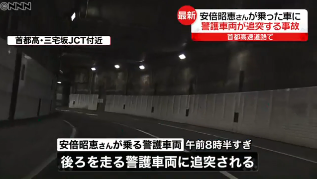 ・千代田区の首都高速・都心環状線の三宅坂JCTで安倍昭恵さんを乗せた警護車両が、後ろを走っていたもう1台の警護車両に衝突されたということです。昭恵さんにケガはありませんでした。