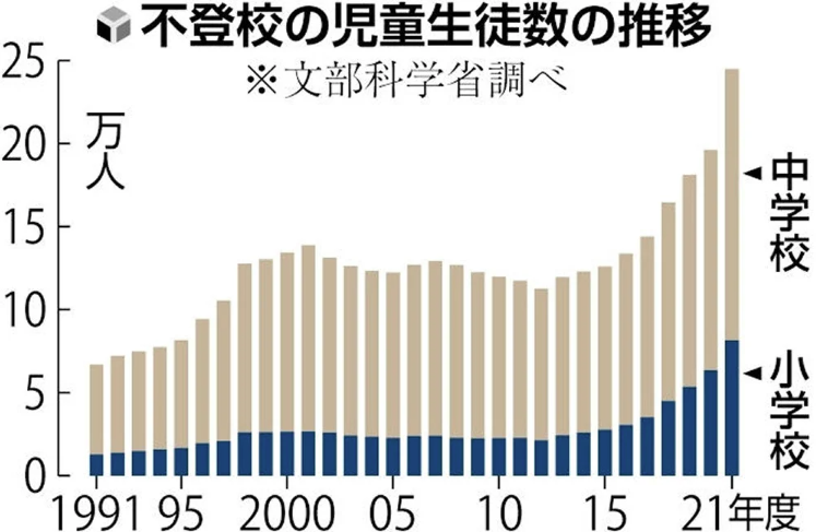 ・全国の小中学校で2021年度に不登校だった児童生徒は、前年度から2割以上増え、24万4940人で過去最多となったことが27日、文部科学省の問題行動・不登校調査でわかった。20万人を超えたのは初めて。