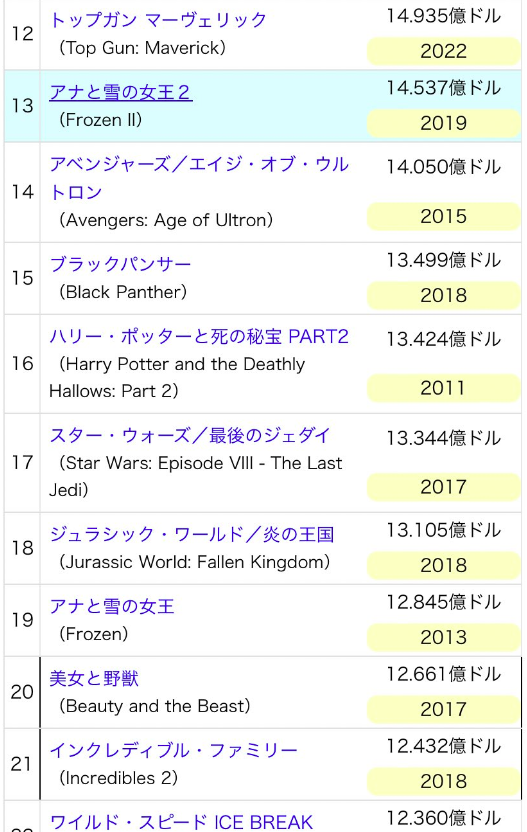 現在そのアニメ映画トップのアナ雪2より早いペースで10億ドル突破したからいけるんちゃう?