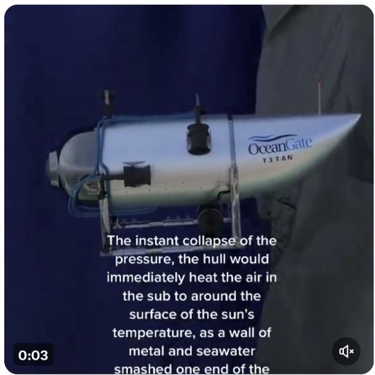 タイタン号の爆縮のイメージ。限界を越えた瞬間に一斉に全方向から約400気圧に一瞬で圧縮され30ミリ秒で核爆発クラスの6000℃が発生し爆散とのこと。大気圏突入と同じ断熱圧縮。これでは灰も残らない。
