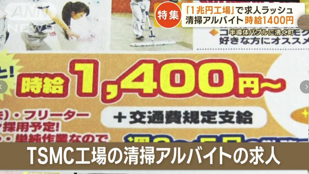 ・地元の求人にも信じられない変化が起きています。8月に掲載されたTSMC工場の清掃アルバイトの求人広告です。時給は1400円。別途交通費支給という地元では破格の待遇でした。