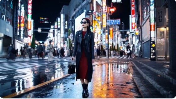 Prompt: “A stylish woman walks down a Tokyo street filled with warm glowing neon and animated city signage. she wears a black leather jacket, a long red dress, and black boots, and carries a black purse. she wears sunglasses and red lipstick. she walks confidently and casually.… pic.twitter.com/cjIdgYFaWq