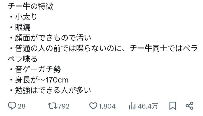 勉強そこそこできる以外当てはまらないけど自分はわりとチー牛やと思ってる