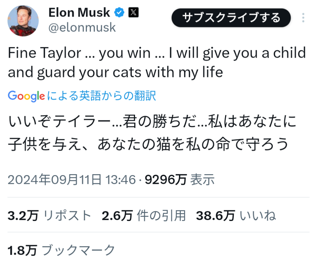・イーロン・マスク氏がXに投稿した、歌手テイラー・スウィフト氏に対するコメントが物議を醸している。スウィフト氏は9月10日、米大統領選テレビ討論会の直後に民主党のカマラ・ハリス候補への支持を表明した。