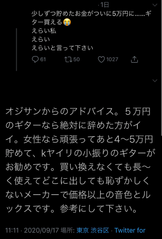 5万のギターが安い部類なのは事実だけどわざわざ本人にリプするおぢはキショい
